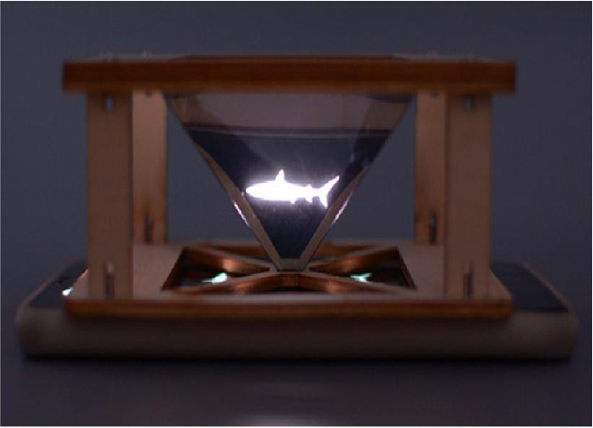 החלקים השקופים של המתקן משקפים את התמונה אל עבר מרכז הפירמידה, ושם נוצרת ההולוגרמה.